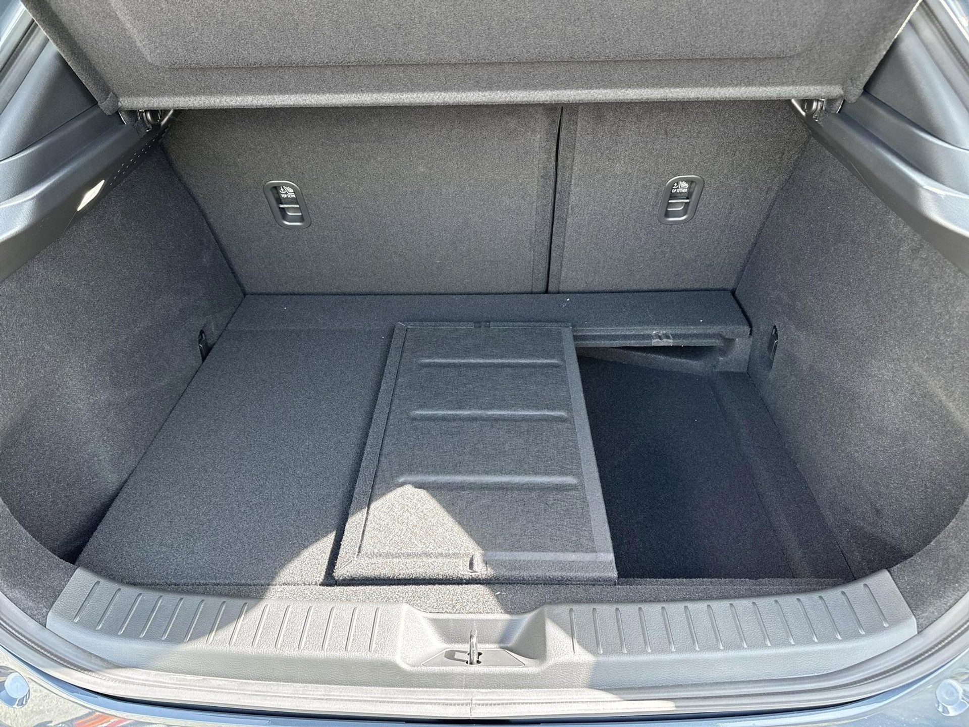 - 3 asymmetrische neerklapbare zitplaatsen achterin in de vorm van een gedeelde bank naar voren kijkend zonder elektrische verstellingen met een niet verwijderbaar opklapbaar kussen plat te vouwen op de vloer