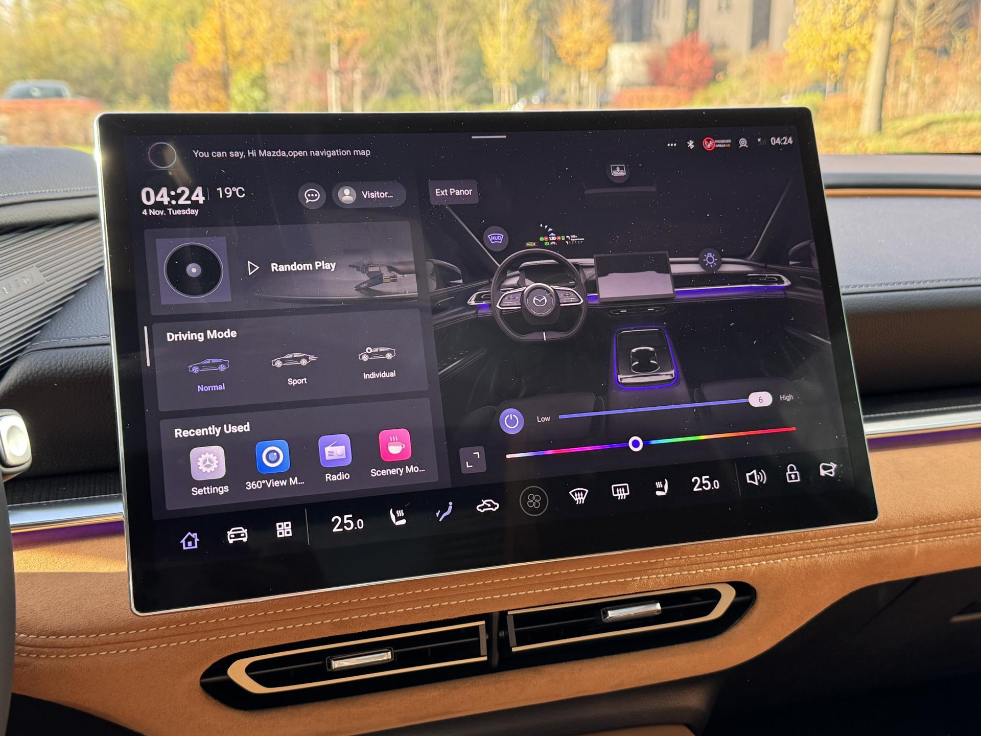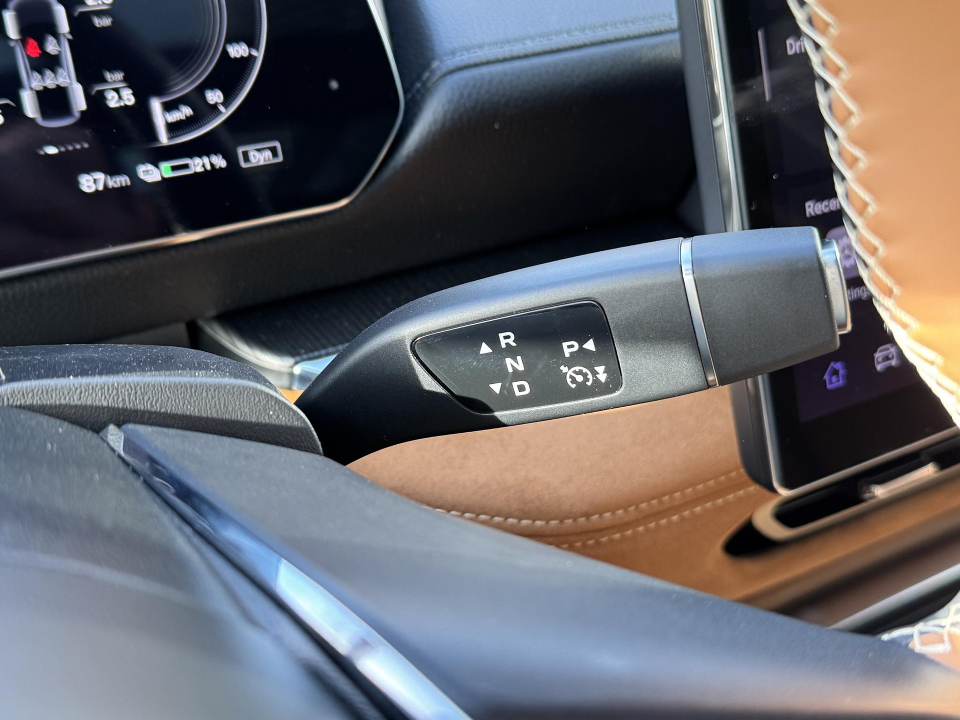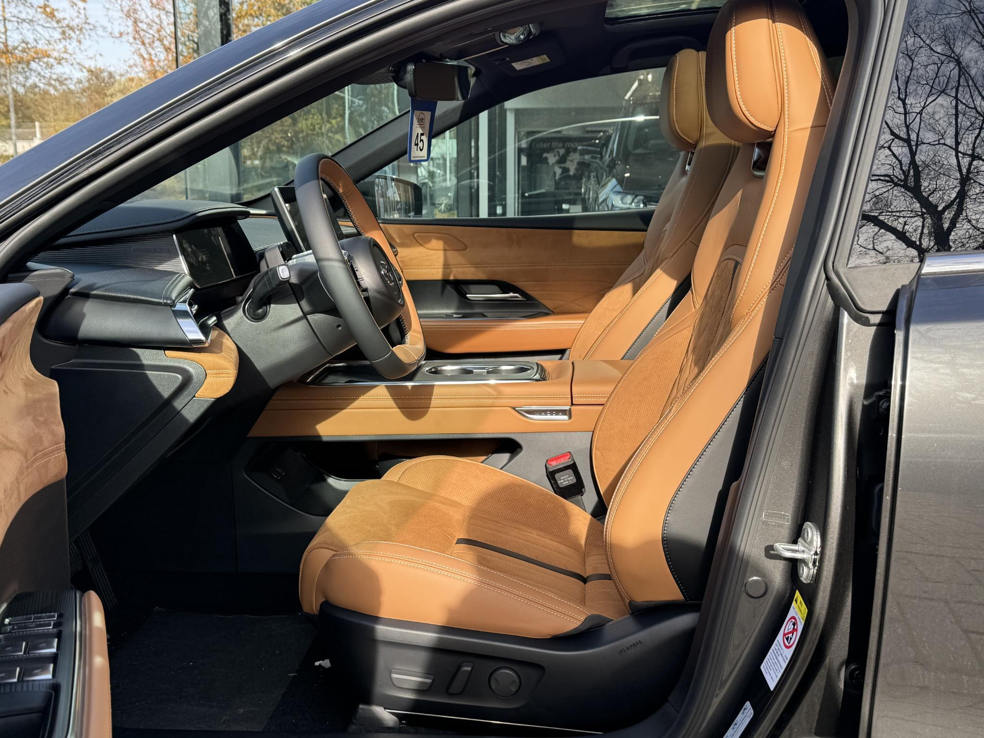 - Luxe metalen afwerking op de centrale vloerconsole, suède afwerking op de deuren en hout en suede afwerking op het dashboard